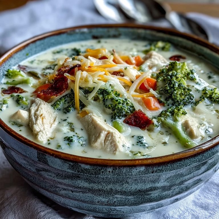 Save to Pinterest There's something about the sound of a whisk hitting hot broth that signals comfort is on the way. My neighbor Sarah showed up at my door one gray afternoon with a bag of fresh broccoli from her garden and asked if I wanted to experiment with soup, and somehow we ended up with this version—creamy, deeply satisfying, and loaded with chunks of chicken that made it feel like an actual meal rather than just a warm cup.