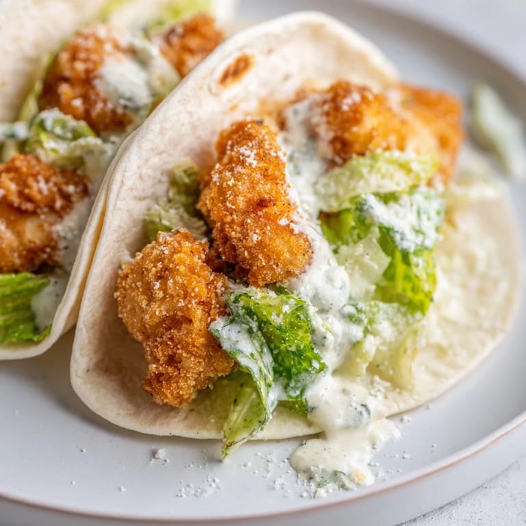 - Lay each tortilla flat and pile chopped romaine down the center, then top with crispy chicken strips, a generous sprinkle of Parmesan, and a drizzle of Caesar dressing. Finish with a grind of black pepper if you like a little heat.