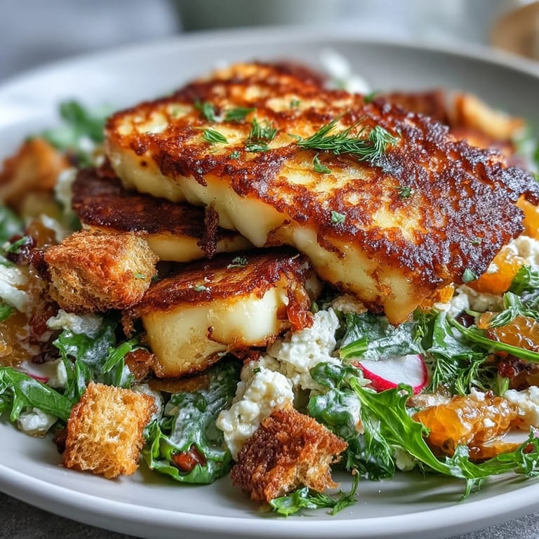 This salad lives in the space between seasons, between temperatures, between what you expect and what actually happens. The warm halloumi melts slightly into the cool greens, the cold blood orange segments provide shock against the crispy bread, and somehow none of it is fighting—it's all conversation. I've made versions where I let the salad sit for five minutes, and the warmth from the halloumi gently wilts just the edges of the leaves, creating this interesting texture variation that makes every bite feel a little different.